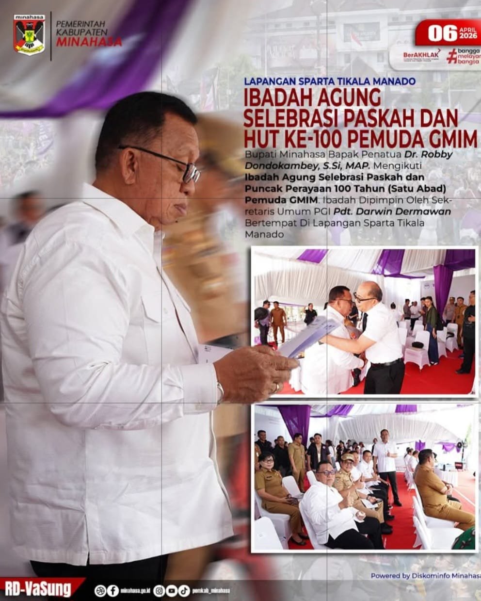 SULUTMEDIA.COM, Tondano– Bupati Minahasa, Robby Dondokambey, menghadiri Ibadah Agung Selebrasi Paskah yang dirangkaikan dengan Puncak Perayaan 100 Tahun Pemuda Gereja Masehi Injili di Minahasa (GMIM) di Lapangan Sparta Tikala. Manado 6/4-2026