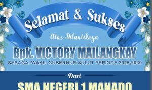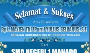 SULUTMEDIA.COM, Jakarta- Keluarga besar SMA Negeri 1 Manado Kepala Sekolah Jemmy Jeremias M.Pd dan peserta didik mengungkapkan Selamat atas di lantiknya Gubernur Sulawesi Utara Mayjen TNI (Purn) Yulius Selvanus. SE & Wakil Gubernur Sulawesi-Utara Dr. Viktor Yohanes Mailangkay SH.MH. Pelantikan oleh Presiden RI Prabowo Subianto, Senin 20/2-2025 di Istana Negara.