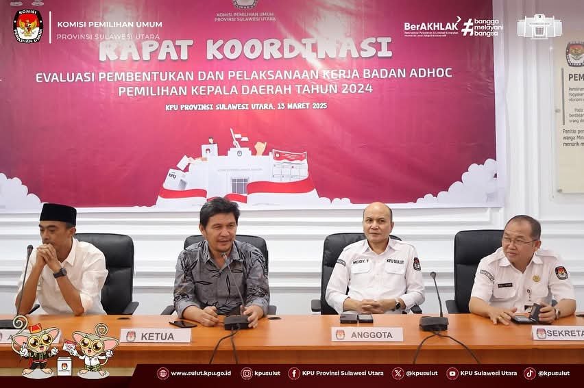 SULUTMEDIA.COM, Manado-Guna memastikan pembentukan Badan Adhoc yang telah dilakukan sesuai dengan prosedur dan peraturan perundang-undangan yang berlaku, KPU Sulut menggelar Rapat Koordinasi Evaluasi Pembentukan dan Pelaksanaan Kerja Badan Adhoc Pilkada Tahun 2024 yang berlangsung di Aula Kantor KPU Sulut , pada hari kamis (13/3).